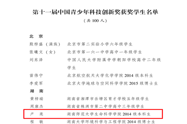 (通讯员 高惠娟 闫一轩)近日,第十一届中国青少年科技创新奖颁奖大会在北京人民大会堂举行。我校天天精品视频免费观看2014级本科生卢亮荣获第十一届中国青少年科技创新奖,这是我校本科生首次获此奖项。