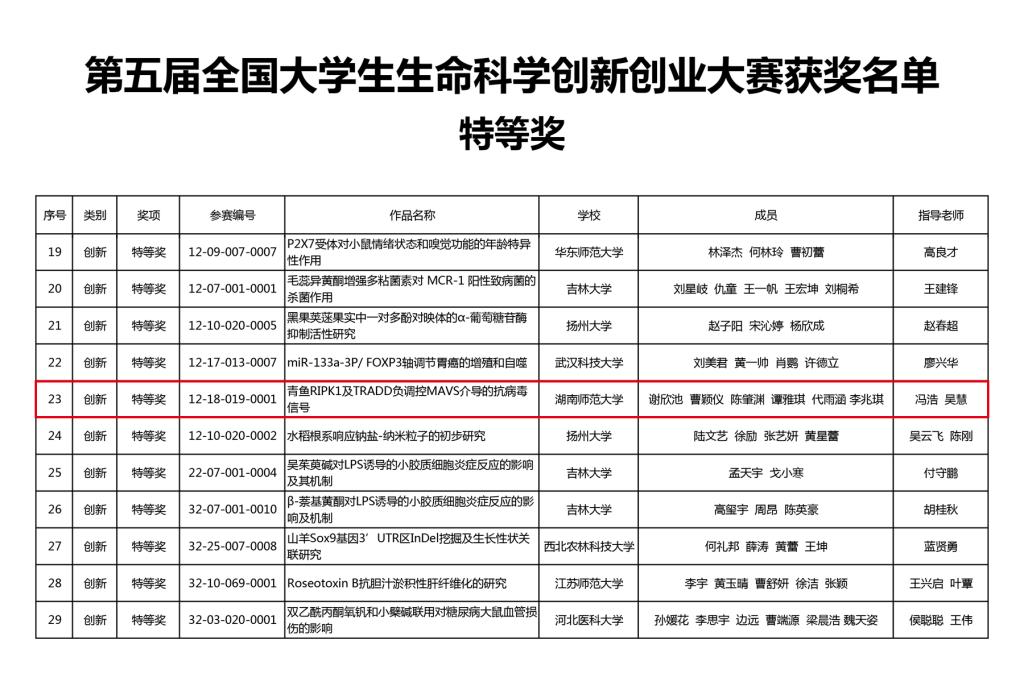 近日,第五届全国大学生生命科学创新创业大赛评审结果揭晓,天天精品视频免费观看冯浩、吴慧指导,本科生谢欣池、曹颖仪、陈肇渊、谭雅琪、代雨涵、李兆琪的参赛作品“青鱼RIPKI及TRADD负调控MAVS介导的抗病毒信号”荣获特等奖。