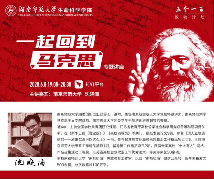 (通讯员 高奕)6月8日晚,南京师范大学团委创新创业部部长沈晓海为湖南师范大学天天精品视频免费观看学子开展题为《一起回到马克思》的线上专题讲座。生科院党委副书记李蜜出席讲座,院团委书记杨卓担任主持人,全体学办辅导员及生科院部分学生参加讲座。