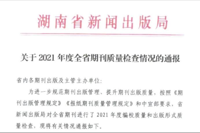 (供稿 生命科学研究杂志)近日,湖南省新闻出版局《关于2021年度全省期刊质量检查情况的通报》公布了2021年度全省具有国内统一连续出版物号且正常出版的248种期刊的编校质量抽查结果,42种期刊的检查结果为优秀(差错率不超过1/10000),占比16.9%,其中《生命科学研究》的差错率仅0.26/10000,居湖南师范大学主管或主办的15种期刊之首,同时名列全省248种期刊第4位(前2%)。