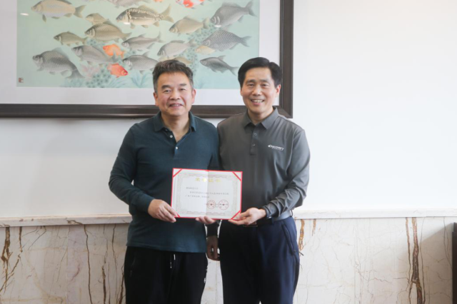 刘少军院士团队报送的合方鲫2号入选2024年重点推广水产养殖品种,何建湘代表全国水产技术推广总站为刘少军授牌。