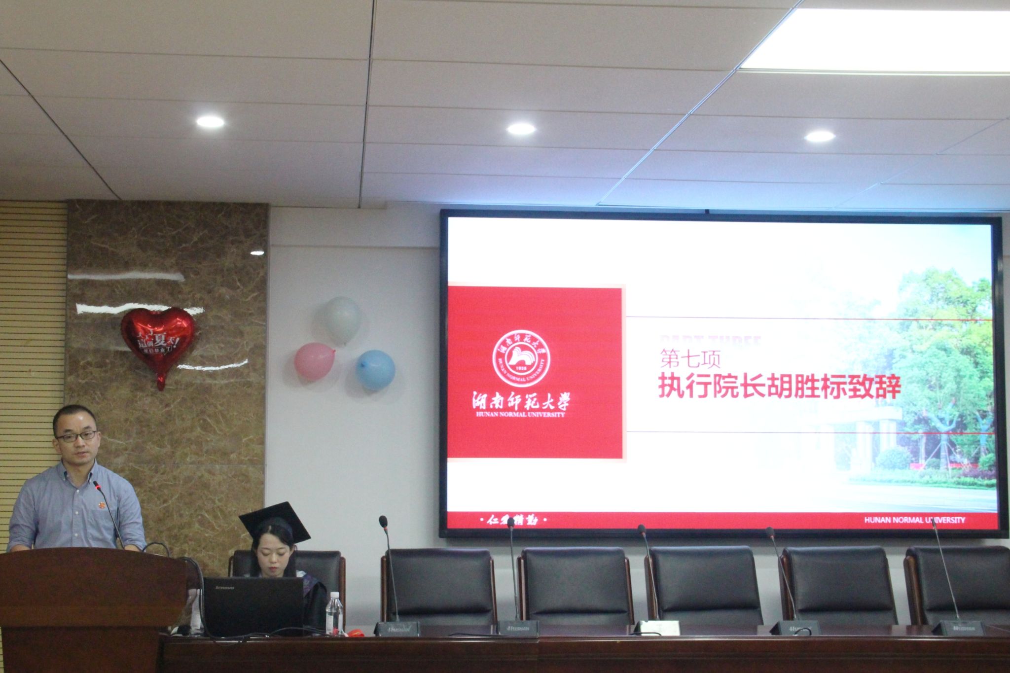 伴随着庄严的国歌声,毕业仪式正式开始。毕业生们观看了毕业祝福视频,回忆从入学时的青涩到毕业时的成熟中每一个阶段的挑战与收获,感受来自老师、学弟学妹以及亲朋好友的祝福与鼓励。低年级学生代表邱靖雯、学生代表胡娇、教师代表徐孟亮、杰出校友罗剑以及学院执行院长胡胜标分别讲话。邱靖雯通过回忆与学长学姐相处的时光表达对学长学姐的不舍,并祝福学长学姐前程似锦、未来可期。胡娇分享了自己的学习经历与体会,表达对母校培养和恩师教诲的感激之情,并表示将怀着对母校的眷恋,满怀信心追逐梦想。徐孟亮代表全体教师为毕业生们送上祝福,期望同学们以梦为马,不负韶华,创造属于自己的未来。罗剑以自己的奋斗往事勉励毕业生们时刻保持学习的态度,期望毕业生们做到诚信为本、立德为先、谦虚谨慎、心怀感恩。胡胜标表示母校永远是毕业生们坚强的后盾,祝愿毕业生们在不同的领域发光发亮。