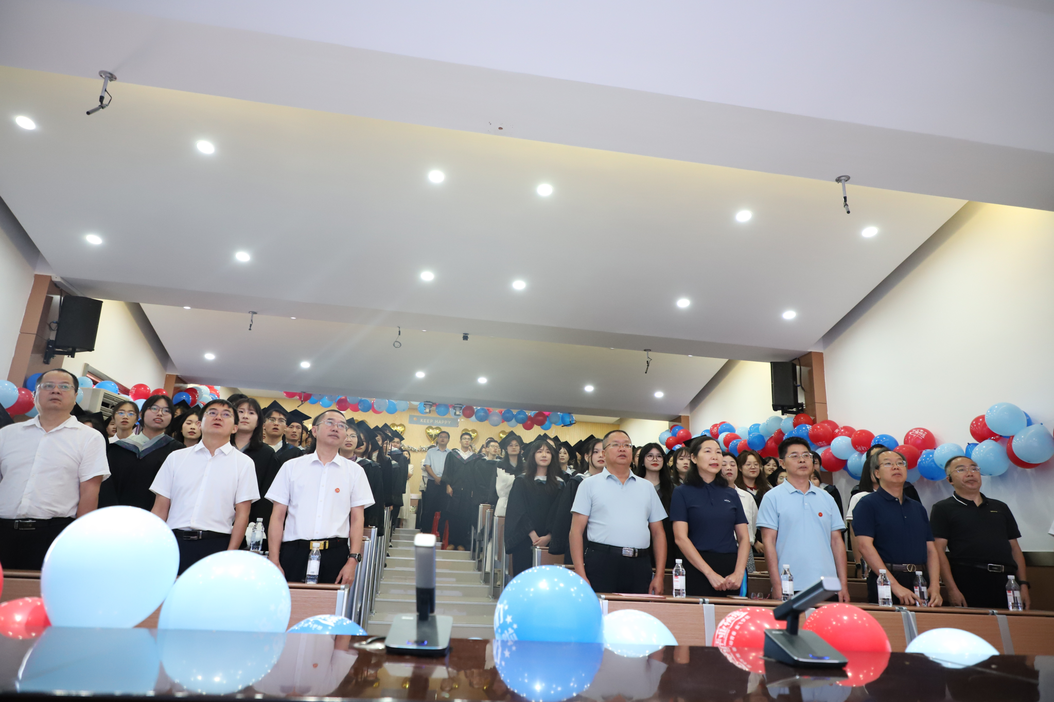 仪式上,全体师生奏唱国歌。随后,现场播放毕业视频,带领师生回顾了毕业生们四年来的学习生活点滴,展现了他们在学术研究、社会实践等方面的成长轨迹。