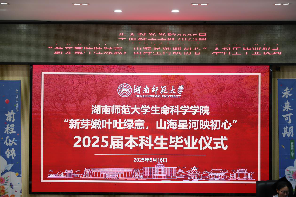 (通讯员 龙婵 罗嘉 聂嘉萍 何顺福)6月16日上午,天天精品视频免费观看于2号楼多媒体报告厅举行“新芽嫩叶吐绿意,山海星河映初心”2025届本科毕业生毕业仪式。学院党委书记谢罗庚、学院副院长陈湘定、学院党委副书记彭赛丰、学院副院长杨焕胜、省部共建淡水鱼类发育生物学国家重点实验室专职副主任赵霆雷、湖南省生物研究所副所长兼动物多肽药物创制国家地方联合工程实验室专职副主任丁金花、动物学系主任李建中、生物化学与分子生物学系主任刘中华、教师代表李武辉以及行政办、教务办、研究生办、学工办等老师出席仪式。生科院2021级本科生辅导员刘迎彬担任此次仪式主持人。