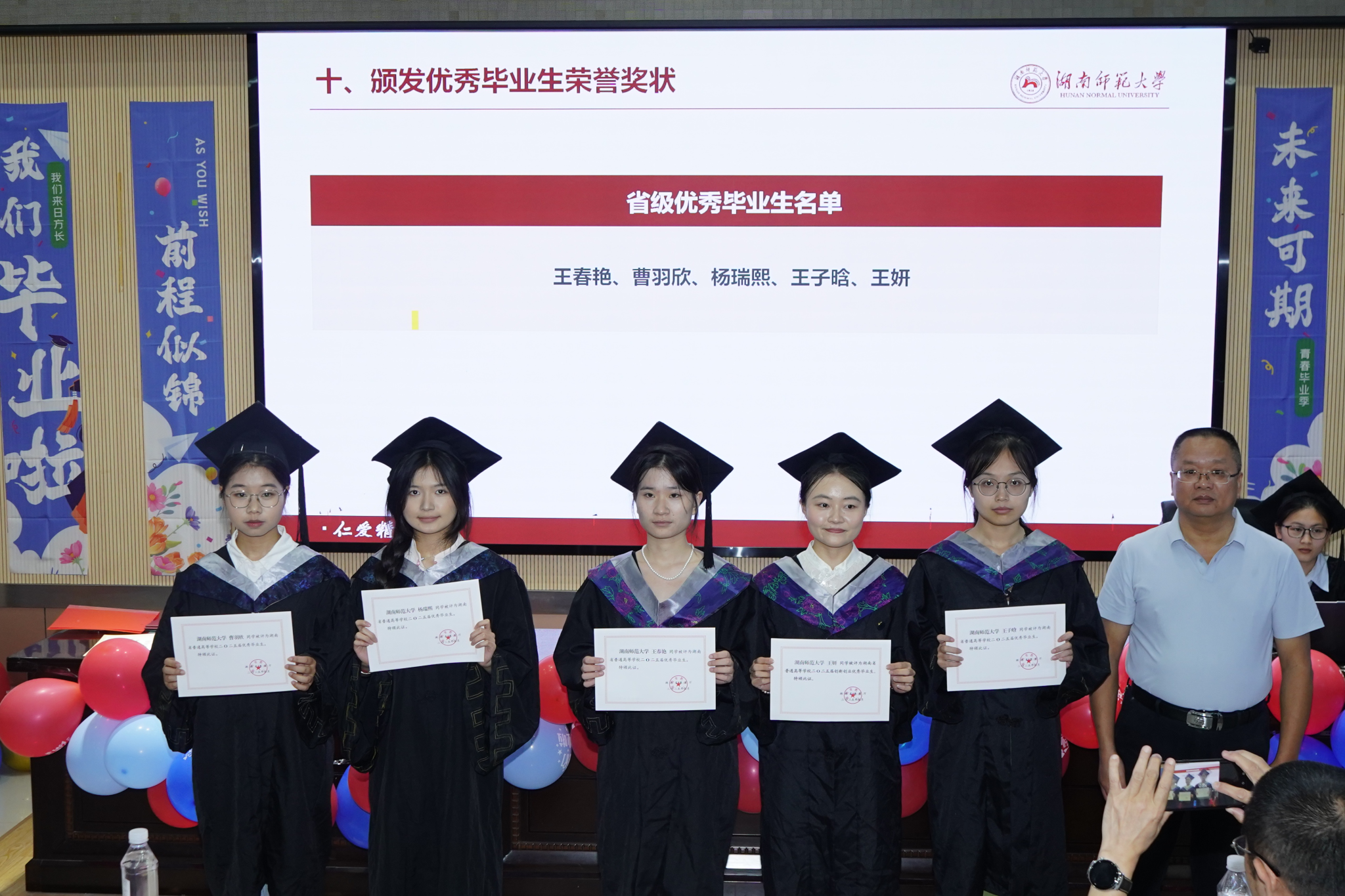 仪式现场举行了多项颁奖及聘任环节。彭赛丰为林海姿、李毕筱乐及何嘉政3人颁发校友联络员聘书;陈湘定向王春艳、向蓉禧、陈心宜、林海姿、杨智鹏及谭益水6名学生颁发优秀毕业论文奖状;谢罗庚、杨焕胜分别为省级优秀毕业生5人、校级优秀毕业生14人颁奖;赵霆雷、丁金花为学生代表颁发学位证书、毕业证书。随后,全体师生奏唱校歌,毕业仪式结束并进行合影留念。