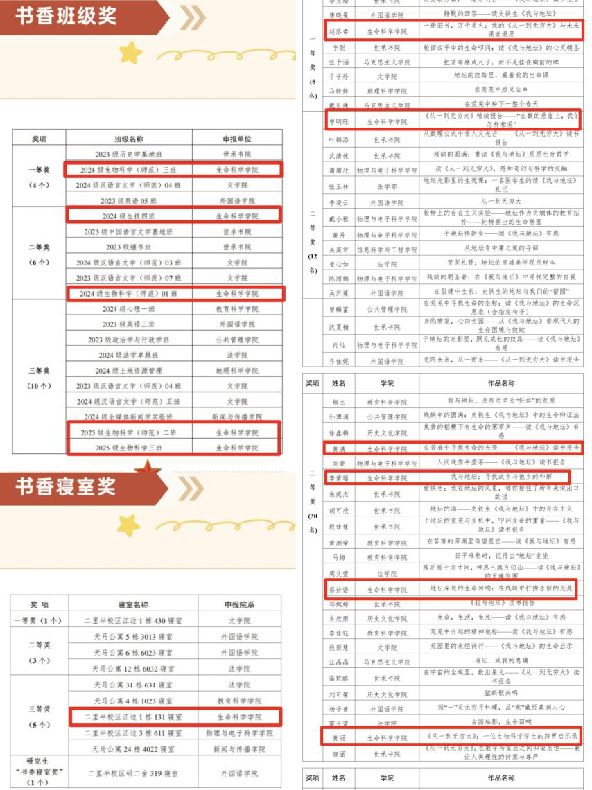 在本次“一校一书”活动中,共获14项荣誉。在集体奖项中,在本次 “一校一书” 活动中,学院师生凝心聚力、深耕阅读,共斩获 14 项荣誉佳绩,尽显书香育人成效。集体奖项方面,学院申报的《“书香寝室” 育人新模式的探索与实践》,凭借创新性的阅读推广机制设计与扎实丰富的活动组织经验,从众多案例中脱颖而出,成功荣获 “创新案例奖”。班级作为阅读推广的重要阵地,此次也涌现出一大批先进典型,24级生科三班荣获校级“书香班级奖”一等奖24级生技四班、24级生科一班荣获校级“书香班级奖”二等奖25级生科二班、25级生科三班荣获校级“书香班级奖”三等奖