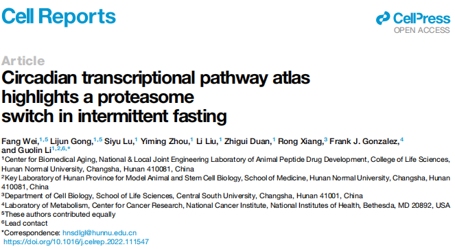北京时间2022年10月25日晚23时,Cell Reports在线发表了湖南师范大学李国林团队的最新研究成果——“Circadian transcriptional pathway atlas highlights a proteasome switch in intermittent fasting”。