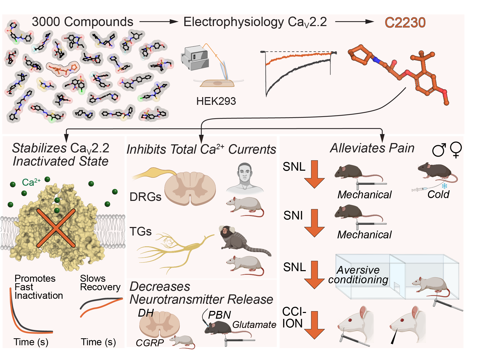 在本研究中,研究人员开发了CaV2.2通道的高活性、选择性、具备优秀脑血比药动力学、使用和状态依赖性小分子抑制剂C2230,深入阐明了其作用机制,通过模式动物-非人灵长类-人类细胞和/或动物模型证实了其靶向CaV2.2高效镇痛,展现出极大的临床转化潜力。