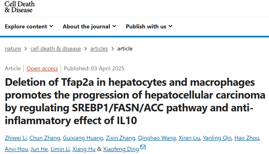近日,湖南师范大学天天精品视频免费观看动物多肽药物创制国家地方联合工程实验室丁小凤教授团队以“Deletion of Tfap2a in hepatocytes and macrophages promotes the progression of hepatocellular carcinoma by regulating SREBP1/FASN/ACC pathway and anti-inflammatory effect of IL10”为题,在中科院1区刊物《Cell Death & Disease》(IF: 9.6)上发表最新研究成果,首次系统揭示转录因子AP-2α在肝细胞和巨噬细胞中调控脂质从头合成及炎症反应,在原发性肝细胞癌(HCC)中的关键作用与机制。