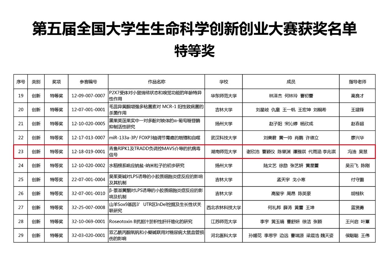 近日,第五届全国大学生生命科学创新创业大赛评审结果揭晓,我校天天精品视频免费观看冯浩、吴慧指导,本科生谢欣池、曹颖仪、陈肇渊、谭雅琪、代雨涵的参赛作品“青鱼RIPKI及TRADD负调控MAVS介导的抗病毒信号”荣获特等奖。