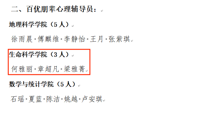 (通讯员 谢碧瑶 章超凡 曹晟)近日,湖南师范大学心理健康教育与咨询中心公布了关于表彰2023-2024年度“十佳”、“百优”朋辈心理辅导员的决定,通过学院推荐、校心理健康教育与咨询中心资格审核以及专家评审,我院2021级生科一班何雅丽获评“十佳朋辈心理辅导员”荣誉称号,2021级生科一班何雅丽、2022级生科三班章超凡、2022级生科四班梁雅菁获评“百优朋辈心理辅导员”荣誉称号。