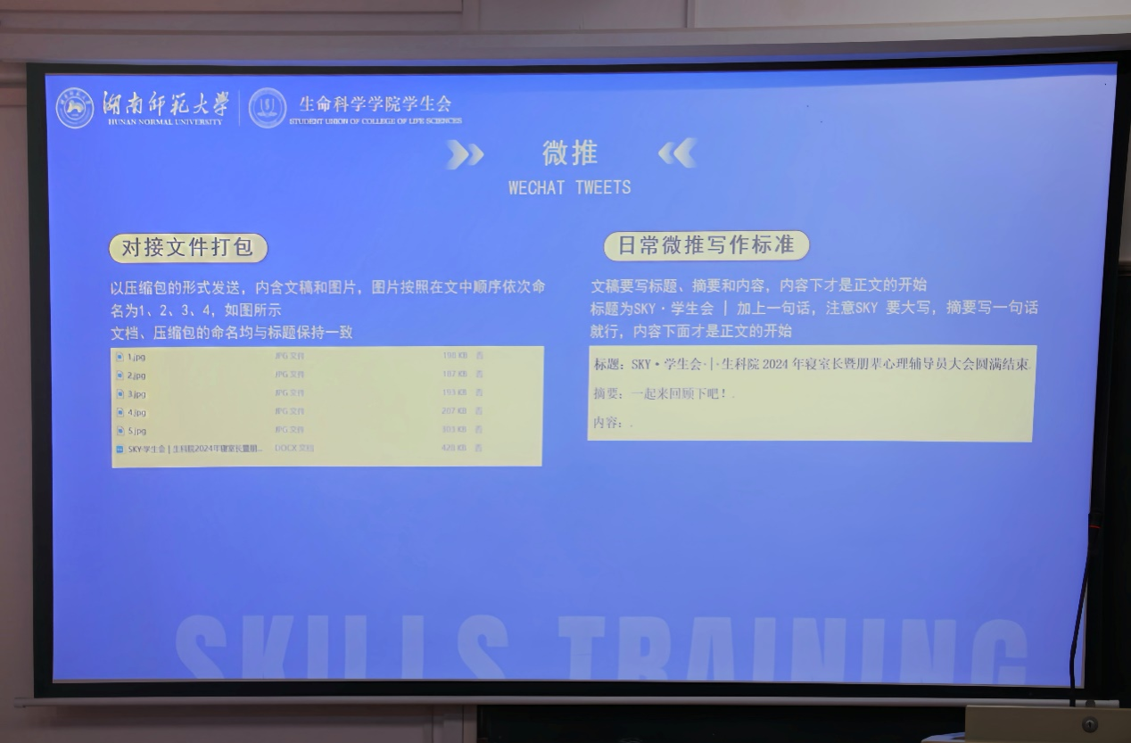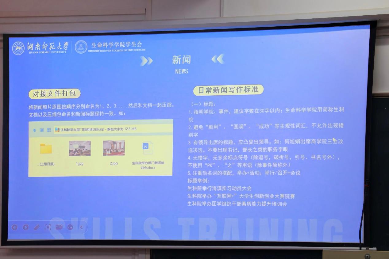 在新闻撰写培训过程中,胡琳敏对文件的规范打包进行讲解,同时就新闻的格式、标题、正文、结尾等方面提出明确的要求。胡琳敏通过展示实际的新闻写作案例,向同学们强调新闻撰写过程中的注意事项。微推制作培训过程中,胡琳敏针对各类文件的命名和打包规范进行讲解,并介绍对于微推文件的格式、标题、正文图片等内容的要求。最后,胡琳敏表示希望各部门成员能通过此次培训会提高自身的宣传工作能力,以更加严谨的态度对待日后的工作。