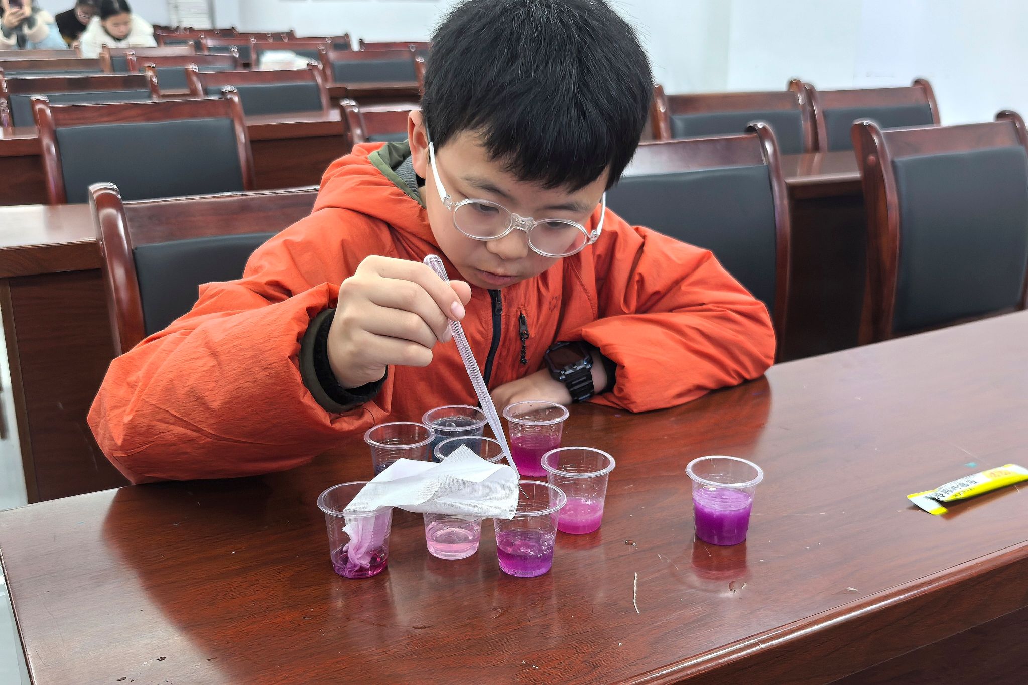 主讲人用蔬菜谜语为引,导入主题,以介绍紫甘蓝的生活习性和作用。他将花青素比作“颜色小精灵”,讲解其在不同酸碱环境下的变色规律。同时,为了让小朋友们直观地感受科学的趣味性,工作人员在现场演示变色实验,并让小朋友们自己动手做实验。在此过程中,志愿者们全程协助小朋友们调配不同溶液、指导其完成花青素变色实验,并鼓励小朋友们发挥创意,调配彩色溶液在棉布上自由创作。活动尾声,小朋友们依次展示自己的作品,并分享活动中的新发现与新感悟。