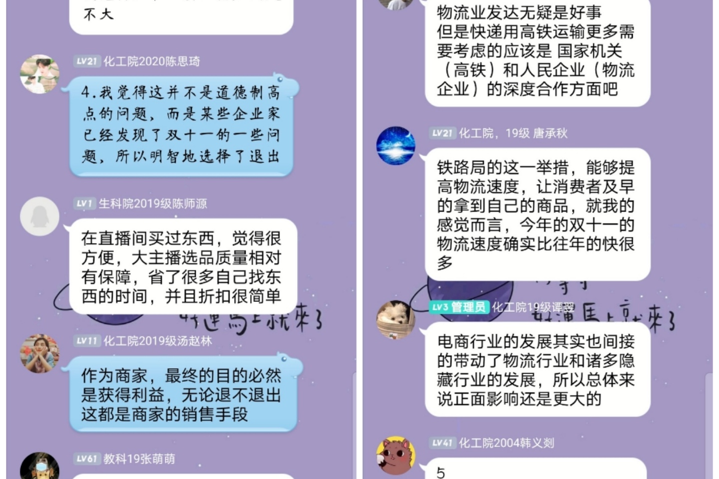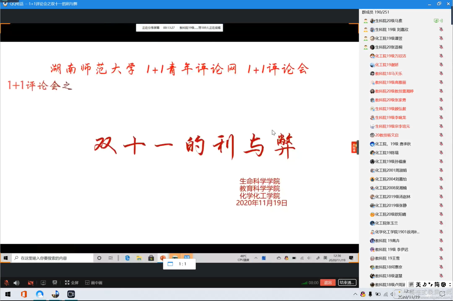 (通讯员马素)11月19日中午,天天精品视频免费观看、教育科学学院、化学化工学院通过线上活动的形式联合举办以“双十一的利与弊”为主题的1+1评论会。马素担任主持人。