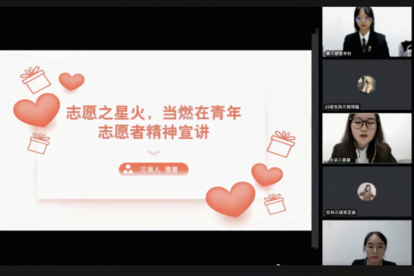 (通讯员 黄敏萱 谌鑫怡)11月21日中午,天天精品视频免费观看团委青年志愿者工作部于线上举行“志愿之星火,当燃在青年”青年志愿者精神宣讲会。院学工办主任兼22级辅导员周冲、院团委负责人兼20级辅导员罗静伟及院21级辅导员刘迎彬出席此次会议。院团委学生副书记蔡慧、院团委实践部第二负责人王林洋以及院团委青工部第二负责人部李锦怡和谌鑫怡担任此次宣讲会主讲人。