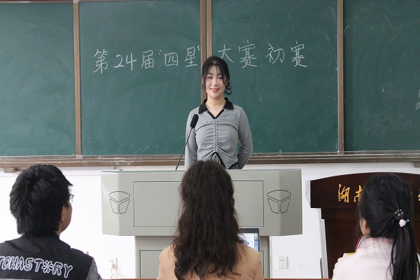 (通讯员 胡琳敏 邱靖雯)为学习宣传贯彻习近平新时代中国特色社会主义思想,丰富学生精神文化生活,湖南师范大学决定举办第24届“四星”大赛。天天精品视频免费观看积极响应学校号召,于3月9日中午,生科院学生会文化体育部于3号楼B308教室举办第24届“四星”大赛初赛。院学生会执行主席吕蕙君、主席兼办公室负责人胡聂文、主席兼文体部负责人邓孝阳以及文体部第二负责人聂嘉萍担任此次比赛评委。