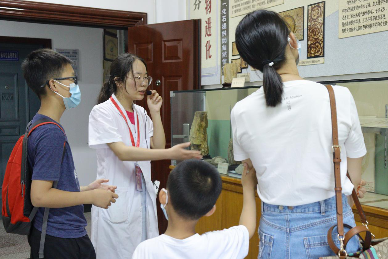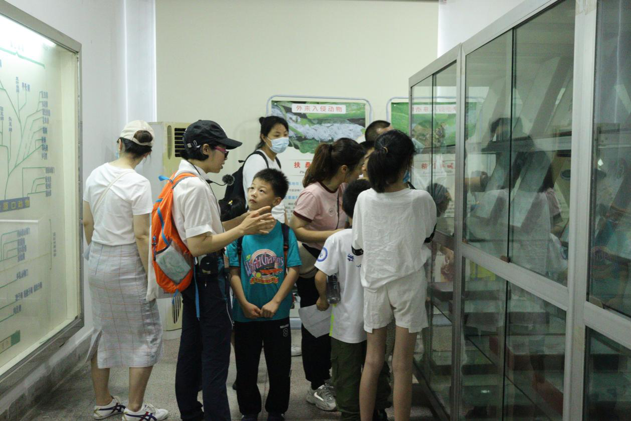 志愿者分为引导和讲解人员,有序进行标本馆开放宣传工作。引导人员于标本馆入口设置关卡,组织参观者分批进入标本馆。讲解人员从生物标本形态特征、生理习性、制作方法等方面,为参观者讲解种子植物、哺乳动物、鸟类以及蝴蝶标本等。同时,他们维持馆内参观秩序和标本安全,防止小朋友磕碰摔倒。参观者自由观察各类生物标本,他们和志愿者进行互动,形成“参观-探寻-提问-研讨-获得答案”的闭环,并完成湖南师范大学馆藏资源精心制作的科普任务卡。