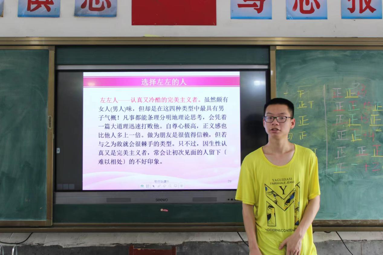 心理健康教育分为理论知识讲解、心理小测试和心理小游戏三个部分。教学组成员们向学生介绍部分心理健康小知识,过程中,学生认真听讲,积极举手回答问题,与老师进行互动。知识介绍完毕后,教学组成员带领学生进行心理健康小测试,帮助学生认识各式各样的性格特征。后由教学组成员组织各班学生进行室内心理小游戏,包括“你画我猜”、“看表情包猜成语”、“逛三园”等,每组学生配合默契,游戏过程也井然有序。室内游戏结束过后,教学组成员们组织学生们到操场上进行室外心理小游戏,包括“123木头人”、“夹纸竞走”、“爱的抱抱”等,学生们热情地参与游戏过程。