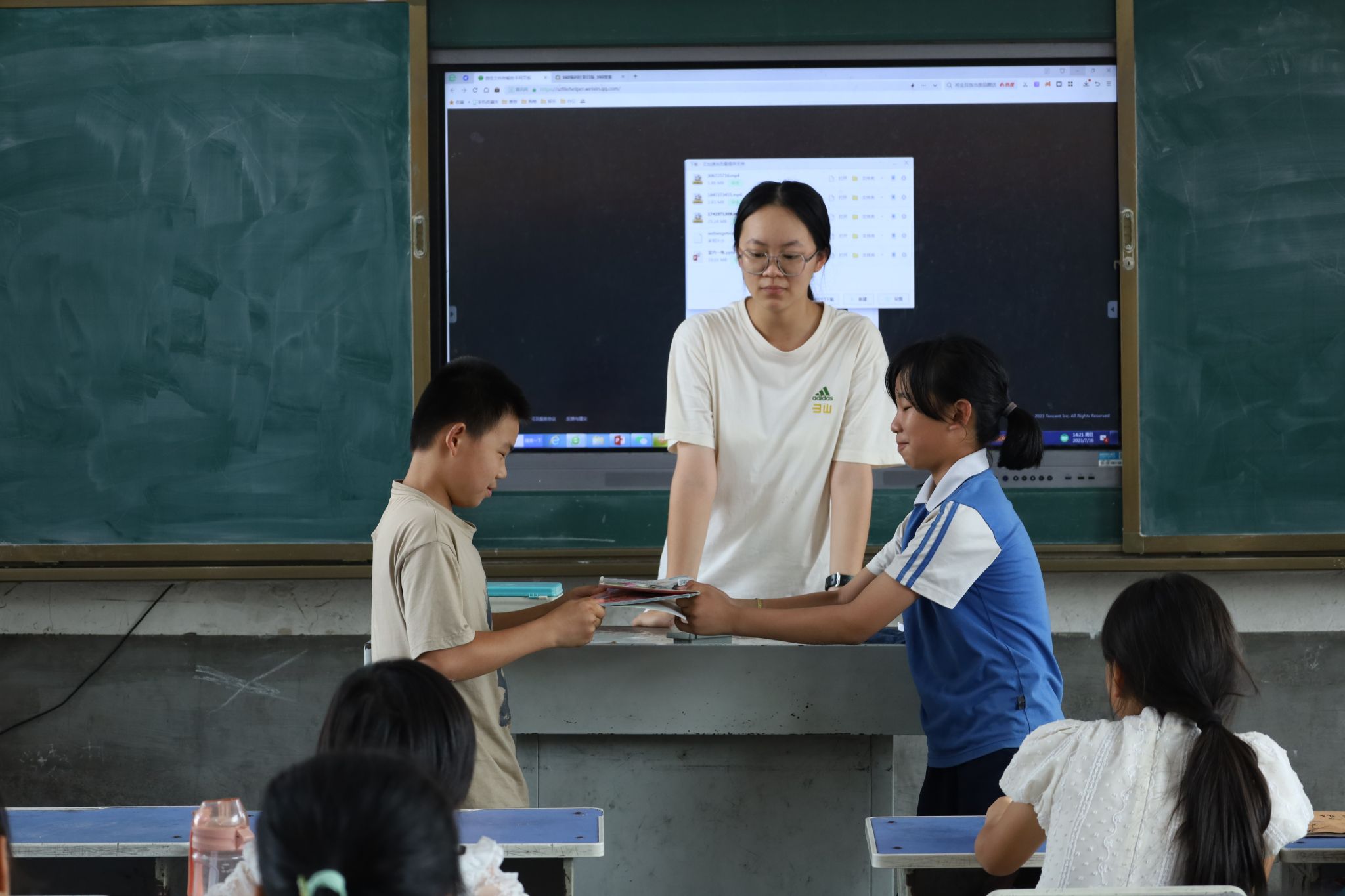 为增进学生对科学知识的理解,激发其对科学学习的兴趣,帮助其走进科学世界,感受科学魅力,教学组成员围绕趣味科学实验展开工作。教学组成员提前积极备课,准备相关科学实验材料,理解并熟悉实验原理。成员们向学生展示趣味科学实验的视频,引导学生通过日常实验走进科学,了解原理并举一反三。成员们组织学生们上台展示“打不开的书”科学小实验,将两本书的每一页依次重叠,再由两名学生分别向两侧拉开,感受摩擦力。提问环节中,同学们积极参与,思考问题,课堂气氛活跃。