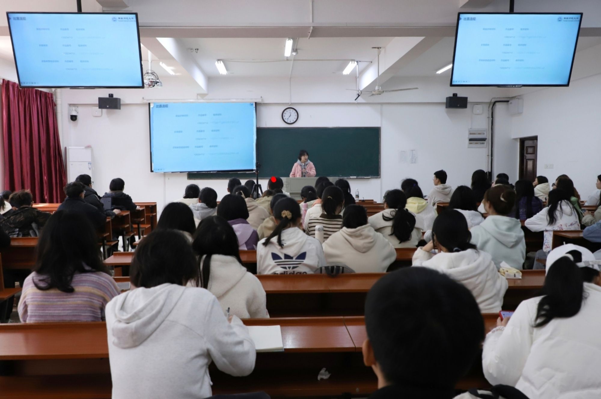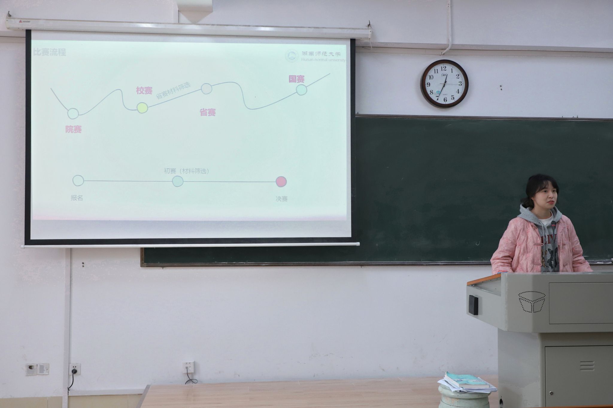 彭予晴从竞赛流程、材料内容撰写以及答辩注意事项三个部分向同学们分享参赛经验。她为同学们详细讲解了赛道类别、竞赛内容以及参赛资格等细则,并通过展示参赛项目计划书目录与已获奖选题作为参考,帮助同学们分析选题角度,同时她补充了材料内容及PPT制作的重要性。彭予晴表示同学们在答辩中应注意仪容仪表的规整和临场的自信表达。
