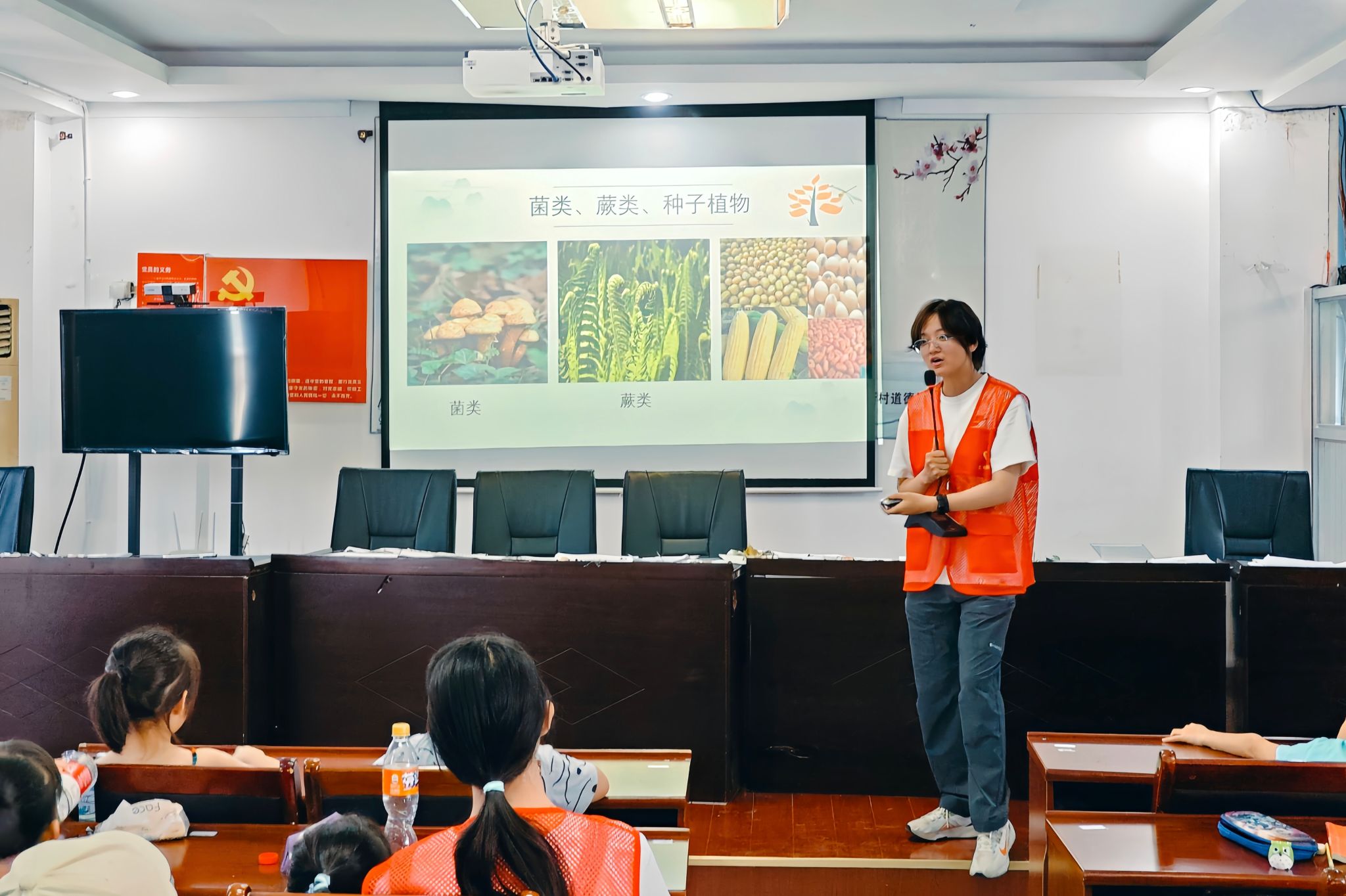 7月10日上午,“湘畔守望”暑期实践团成员主讲人毛艺颖从认识生活中的植物、植物分类因素、植物生长历程以及生活科普四个部分开展“认识种子植物”课程。她通过展示图片、举手答问的形式介绍了生活中常见的植物分类,包括种子植物、藻类、地衣、苔藓、菌类和蕨类植物等。此外,毛艺颖分享植物不宜放在卧室或过多拨弄叶片等例子,向小朋友们进行关于如何养护植物的生活科普。她以茎中有乳汁等有毒植物的代表识别特征为例,提醒小朋友们在日常生活中要正确对待和处理植物,在确保安全和健康的前提下学会与自然交流互动。