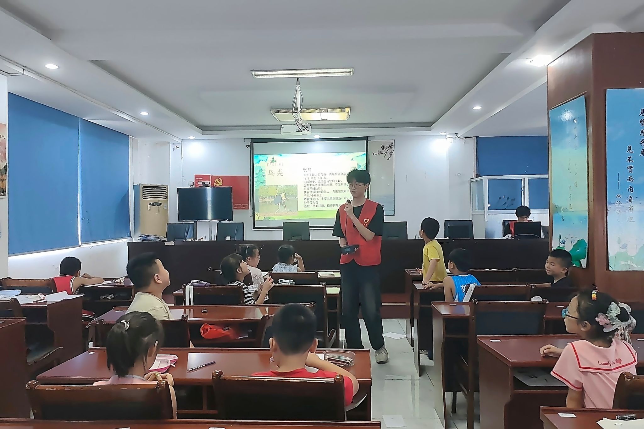 陈贤负责鸟类和哺乳动物相关知识的讲解,他带领小朋友们探索鸟类和哺乳动物的世界。他列举乌鸦、小熊猫、海豹、鲸鱼以及秃鹫等动物图片,让小朋友们根据图片辨认出动物的种类和名字。随后,他借助科普视频,为小朋友展示鸟类和哺乳动物的独特习性、形态特征及其分布地点。小朋友们表示课堂答问的互动形式帮助他们有效巩固了鸟类和哺乳动物共同特点等知识。