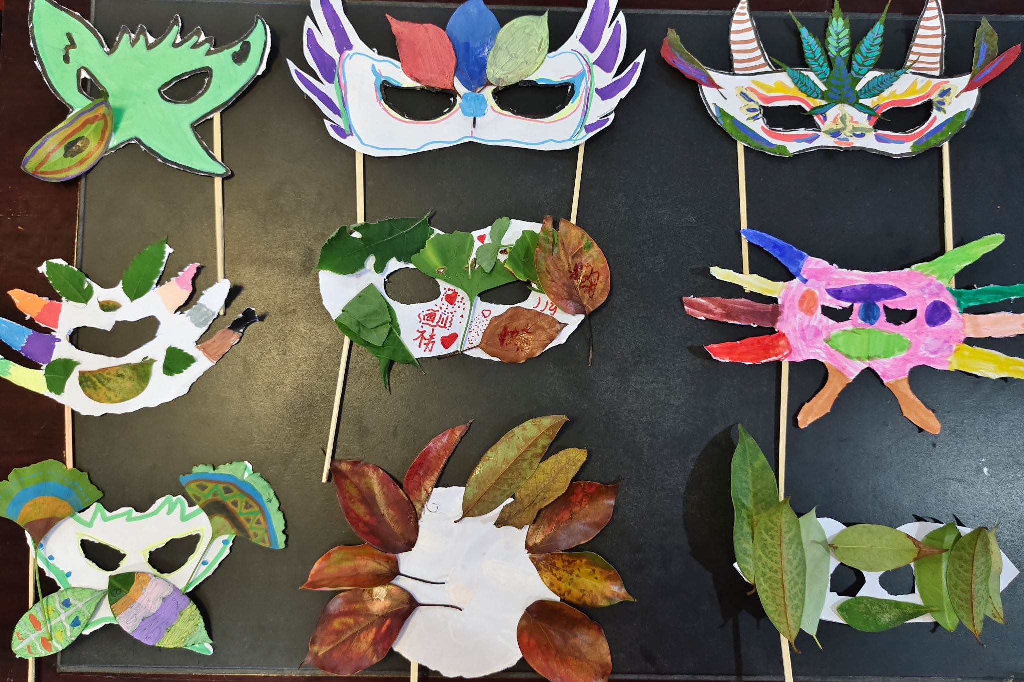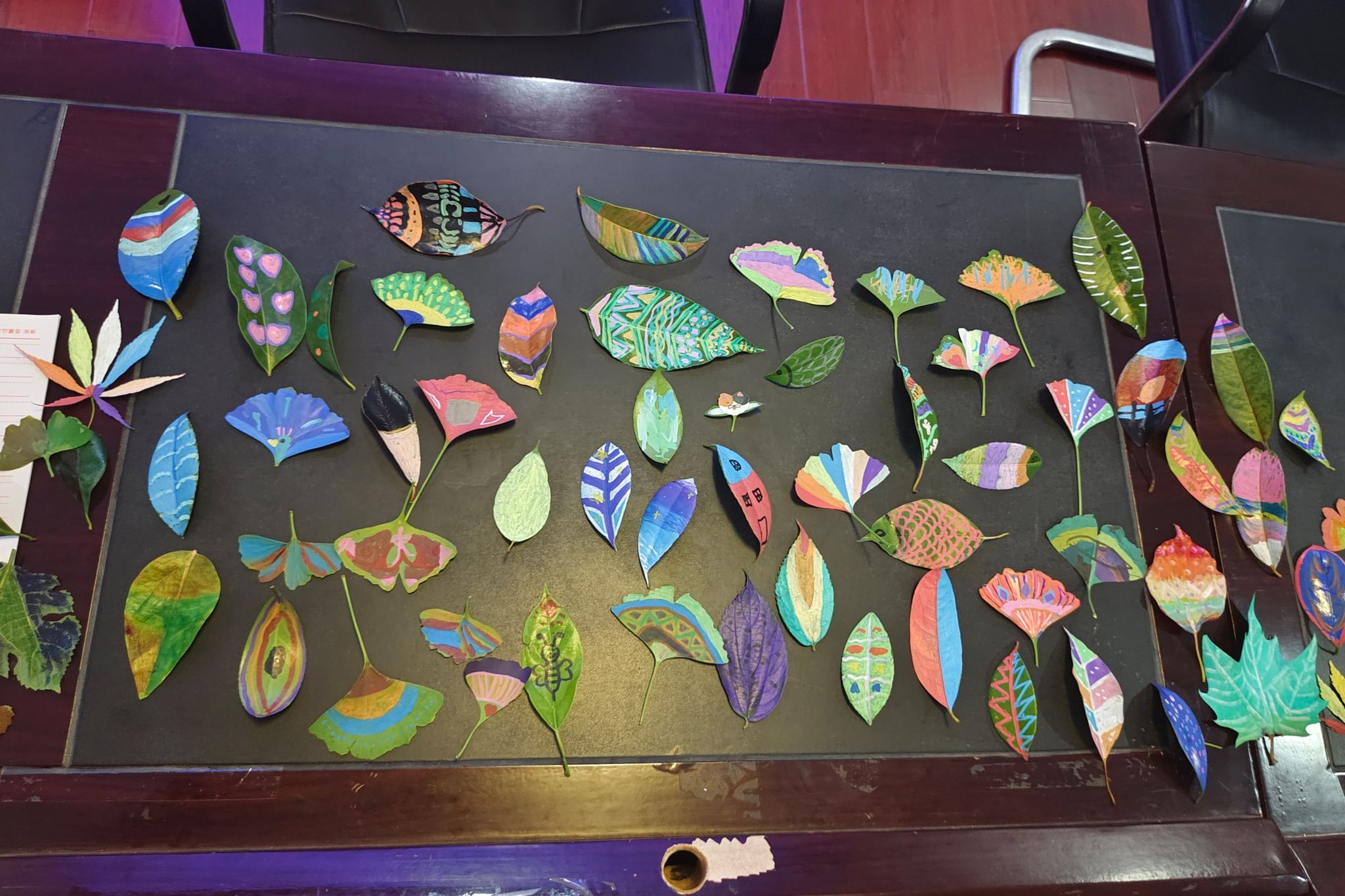 活动安排包括树叶绘画课、室内游戏课和舞会面具制作课四个部分。第一位主讲人以“世界上没有完全相同的两片叶子”为切入点,引出叶片多种多样的形态特征,激发小朋友的学习兴趣。她以图片展示的形式向小朋友们讲解树叶类型,帮助小朋友们进一步了解树叶的形态特征。主讲人向小朋友们介绍制作彩色树叶的步骤,并演示部分图案的画法,为小朋友们作画提供创作灵感。随后,实践团成员分发树叶以及其他绘画材料,与小朋友们一起投入到创意树叶制作过程之中。