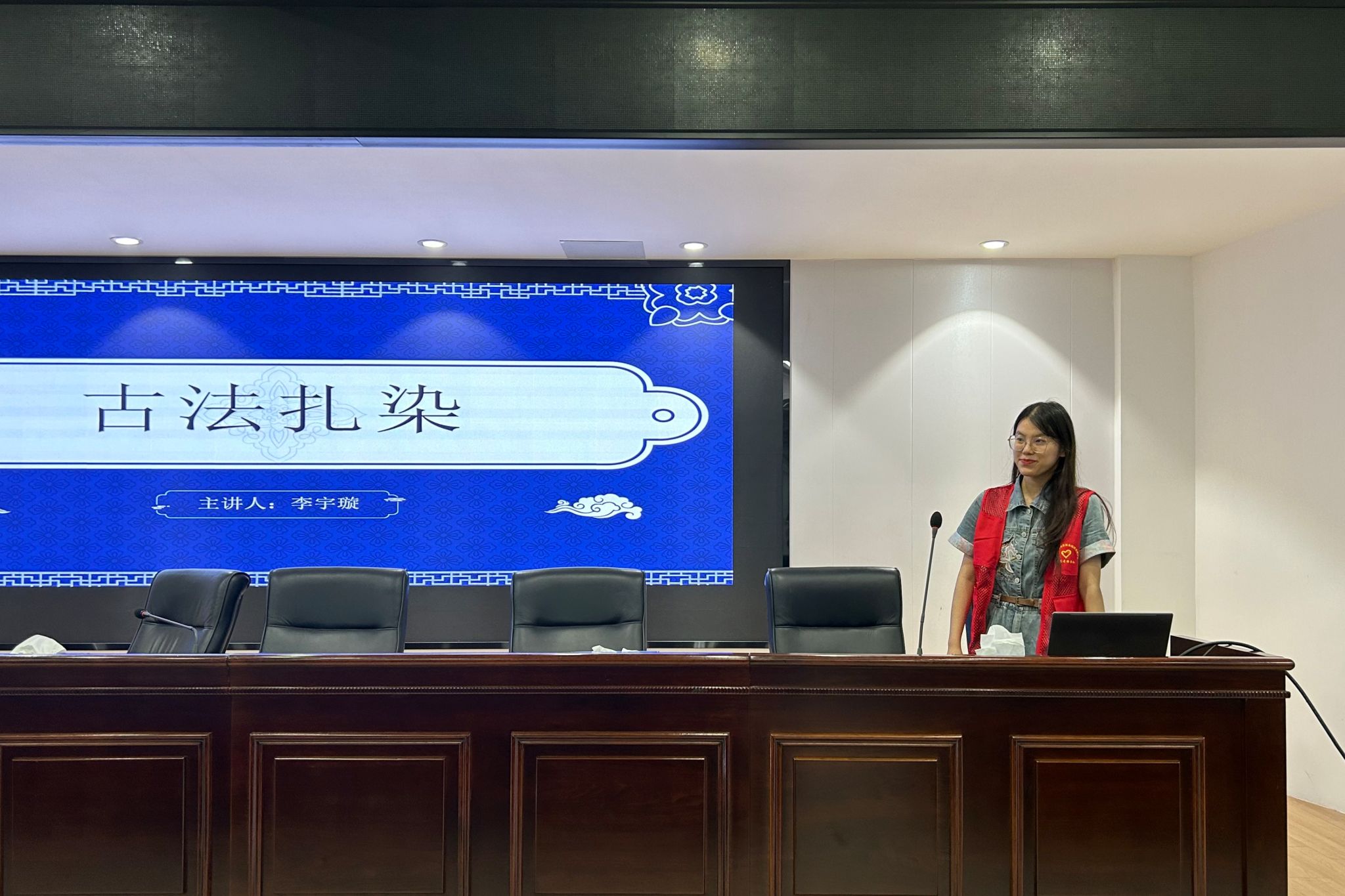 (通讯员 李嘉昕 张彤)7月18日下午,天天精品视频免费观看“湘畔守望”——赴桔子洲街道暑期实践团于桔子洲街道办事处开展“古艺新颜,扎染流韵”传统工艺课程。实践队队员李宇璇、顾鑫悦担任此次课程的主讲人。