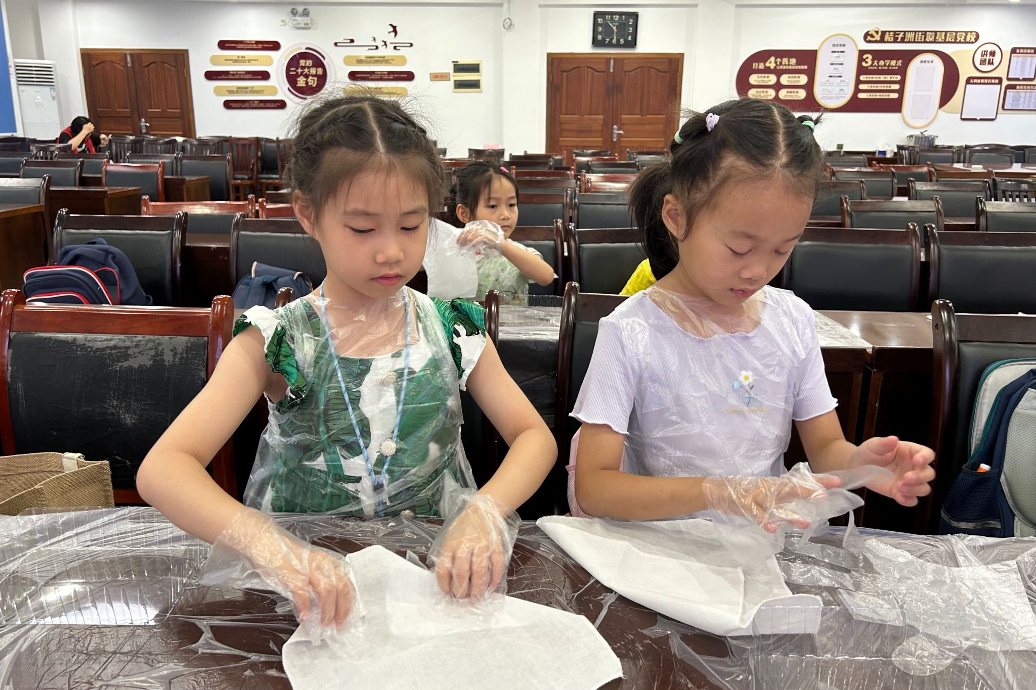 顾鑫悦结合视频帮助小朋友了解折纸绣球的制作步骤,她为小朋友分发折纸,演示纸张折叠与粘黏的方法。同时,顾鑫悦提醒他们注意挤用的胶水量,避免胶水粘手。实践队队员帮助小朋友进行折叠、穿绳,制作完成后小朋友互相展示成品。