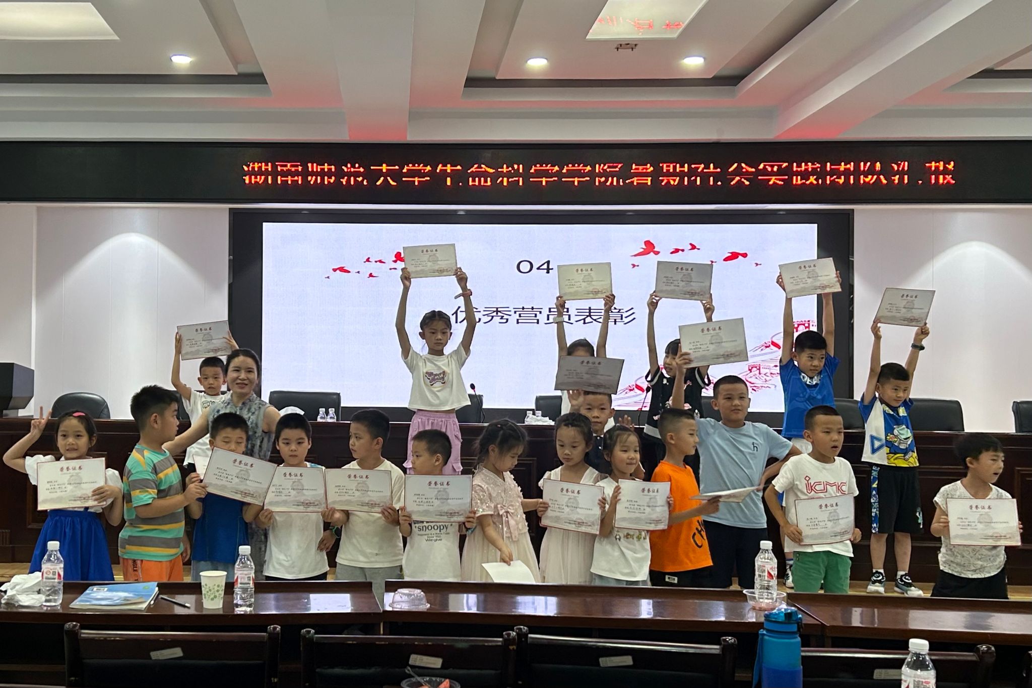 唐文靓祝贺小朋友们完成暑期实践活动,她肯定了在实践队用心备课与教学下,小朋友们收获到丰富的知识并锻炼了动手操作能力。她对社区工作人员以及实践队表示感谢,说明活动的开展离不开每位成员的共同努力,并对往后活动合作提出期望。罗静伟进行总结发言,她对实践队的教学准备与课程安排表示肯定,感谢桔子洲社区的帮助与支持,并对小朋友们的未来发展提出祝愿。随后,实践队队长黄少彬作为代表发言,他通过播放记录影片的方式展示教学开展过程和师生间的交流互动,汇报整个活动取得的成果。此外,小朋友们进行古风舞蹈、《小美满》、《勇气大爆发》等才艺展示节目,并领取奖状合影留念。