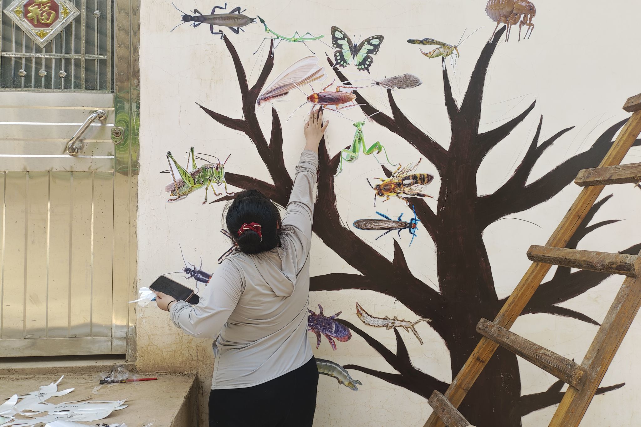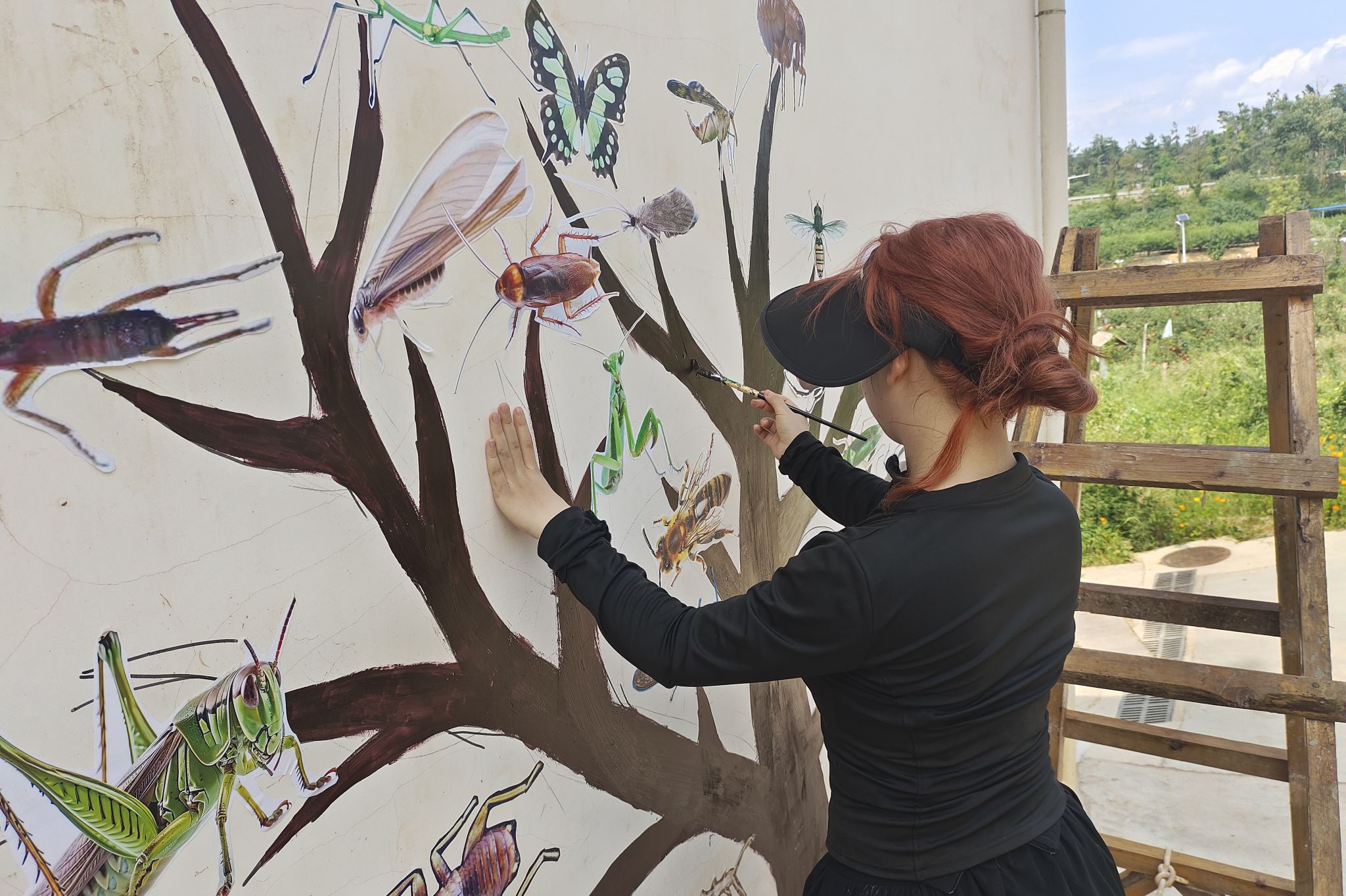 实践团成员围绕“昆虫世界的奥秘”、“美丽乡村自然风光”、“白箬铺特色文化”这三大主题设计和开展墙绘实践活动。在奇稷布谷基地,实践团成员商讨绘画主题和风格、修改文化墙线稿,让墙绘与建筑风格相匹配,以达到更好的人文效果。实践团成员们在户外调配颜色、描边勾线、绘图上色,力求精准细致。同时,为保证工作效率,实践团成员分成两个小组,利用清晨和傍晚两个时间段开展墙绘绘画。墙面上螳螂目、鳞翅目、脉翅目等昆虫栩栩如生,让人感受到生命的奥秘。这些画不仅融入了有趣的科普知识和深厚的人文内涵,还寄托了实践团对乡村的美好憧憬。
