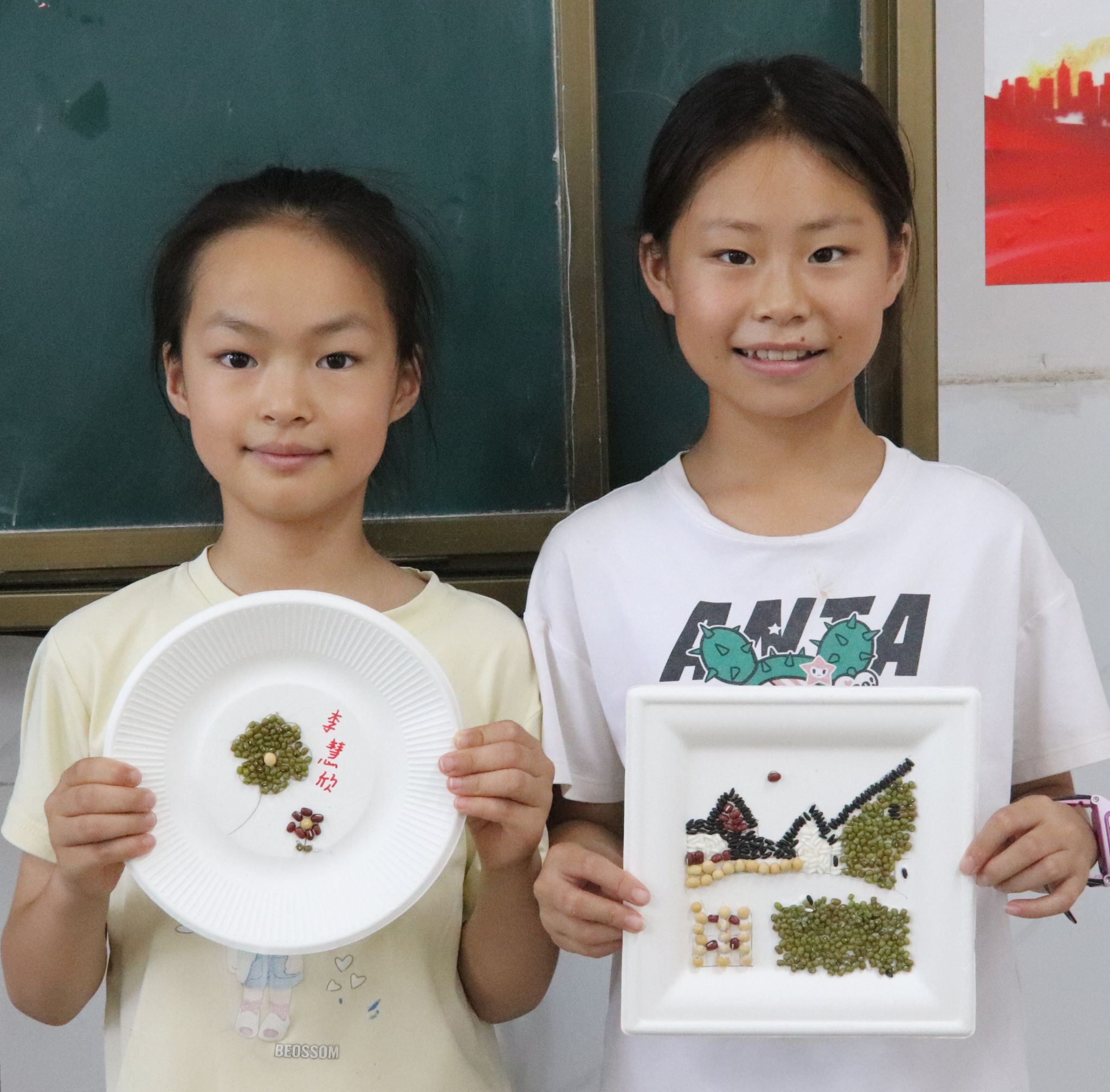 孩子们展示五谷拼贴画作品