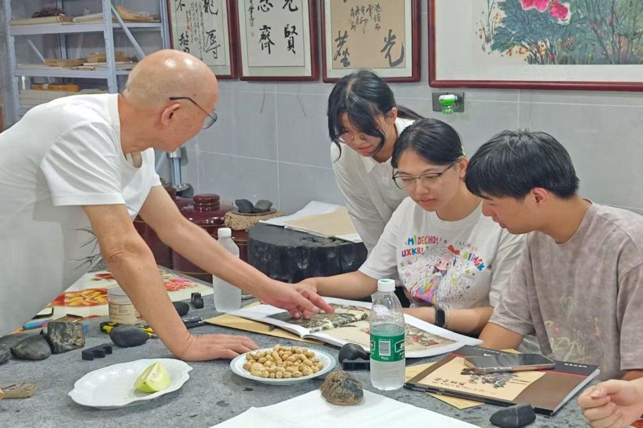 实践团成员走进张东林老师的工作室开展交流活动,期间获赠张东林老师的书法作品,深入了解版画、国画创作技法与文化内涵。张东林向实践团成员介绍,工作室中陈列的两幅版画作品的创作源于他后期对山水风格版画的创作偏好。实践团成员通过近距离观察,了解到这类版画的创作特点。除版画外,实践团成员对张东林的国画作品进行欣赏,其中以虾为主题的创作尤为突出。在作品展示过程中,张东林讲解了“淡墨勾虾身,浓墨点虾眼”的创作技法,实践团成员观察到虾的质感与动态在笔锋转折间的呈现效果。交流中,成员围绕绘画创作的具体步骤与技法要点与张东林展开探讨,进一步明晰版画与国画在创作理念、表现形式上的差异与联系。