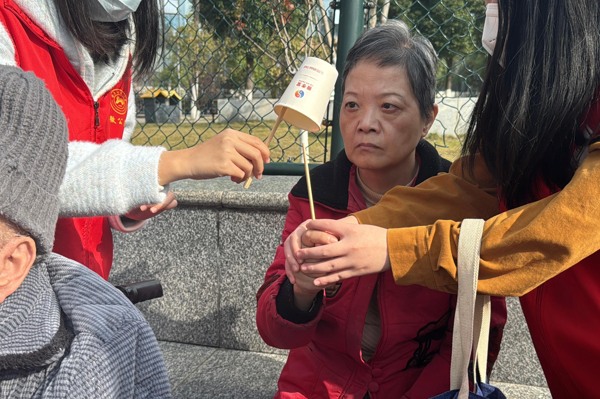 为确保户外陪伴的安全与顺畅,活动伊始,志愿者们接受细致的岗前培训。通过细致讲解和现场演示,大家重点掌握认知症长辈的沟通方式,以及轮椅使用和外出照护的关键要点。随后,志愿者们分组陪同老人前往照护中心旁的篮球场,暖阳之下,志愿者们围坐在一起与老人亲切交谈,耐心倾听老人分享过往生活趣事与人生阅历。期间开展的传递纸杯小游戏互动性十足,老人们积极参与,在轻松的协作中增进情感联结,现场欢声笑语不断,氛围温馨融洽。活动尾声,志愿者们细心搀扶行动不便的老人,稳妥推行轮椅,将老人们安全护送回居所,全程照料细致周到,尽显贴心关怀。