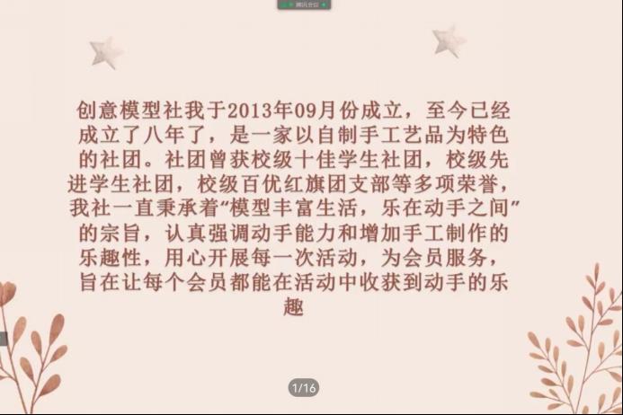 (通讯员 张馨月 庾雪菲 赵婧)11月13日下午,天天精品视频免费观看创意模型社举行线上会员动员会议。生科院创意模型社理事张馨月担任此次会议主讲人。