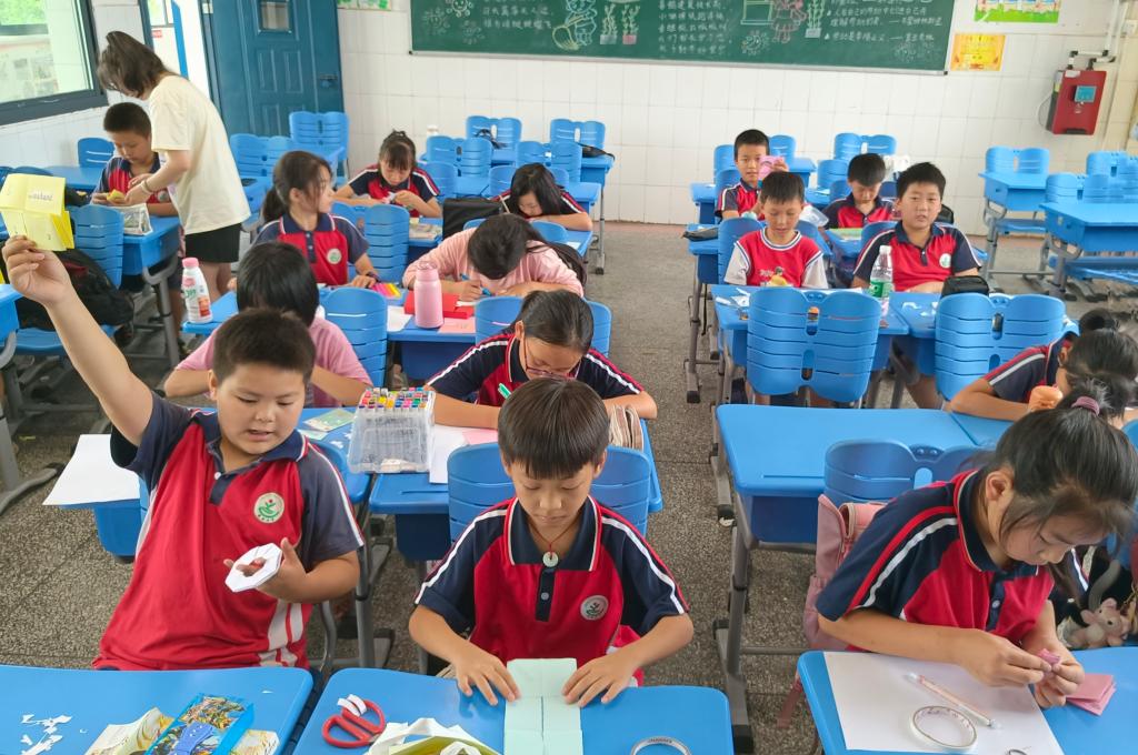 此次活动仅在四年级开展,分为贺卡制作步骤讲解、贺卡制作以及作品展示三个部分。赵琦为学生讲解翻转贺卡的制作步骤,与学生一同制作翻转贺卡。学生动手创作,完成翻转贺卡的制作,并在贺卡上进行绘画。老师展示学生作品并为学生拍照留念。