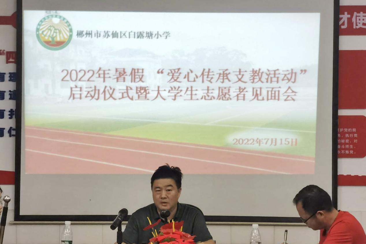(通讯员 宁玲惠 赵曼 刘智慧)7月15日下午,天天精品视频免费观看三叶草园艺社赴郴州市苏仙区白露塘小学暑期社会实践团与白露塘小学校委会成员开展暑假“爱心传承支教活动”启动仪式暨大学生志愿者见面会。白露塘小学校长首林峰担任会议主持人。副校长李吉斌、唐容容、教务办主任文斌、政教处主任陈俐璇、后勤处主任吴代万、办公室主任张红娟、少先队辅导员李思琪出席此次会议。