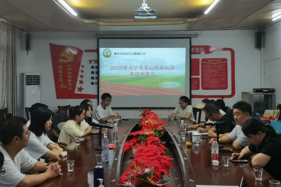(通讯员 陈湘君 赵曼 刘智慧)7月29日下午,天天精品视频免费观看三叶草园艺社赴郴州市苏仙区白露塘小学暑期社会实践团与白露塘小学校委会成员开展2022年大学生爱心传承活动欢送座谈会。白露塘小学校长首林峰担任主持人,副校长李吉斌、副校长唐容容、教务办主任文斌、政教处主任陈俐璇、后勤处主任吴代万、办公室主任张红娟、少先队辅导员李思琪出席此次会议。