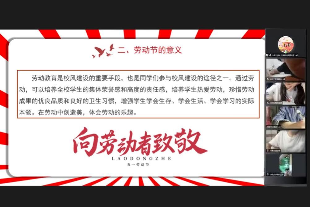 活动分为劳动节介绍,奋斗者们故事分享,奋斗精神内涵阐释,欣赏劳模视频四部分。肖玉婷向会员们介绍了劳动节的来历和意义,并借门捷列夫、华罗庚、邓亚萍、巩立姣等人的奋斗故事向同学们强调了奋斗对于个人成长和社会发展的重要性。同学们表示通过观看相关视频收获颇多,同时也对劳动与奋斗有了更深刻的认识。