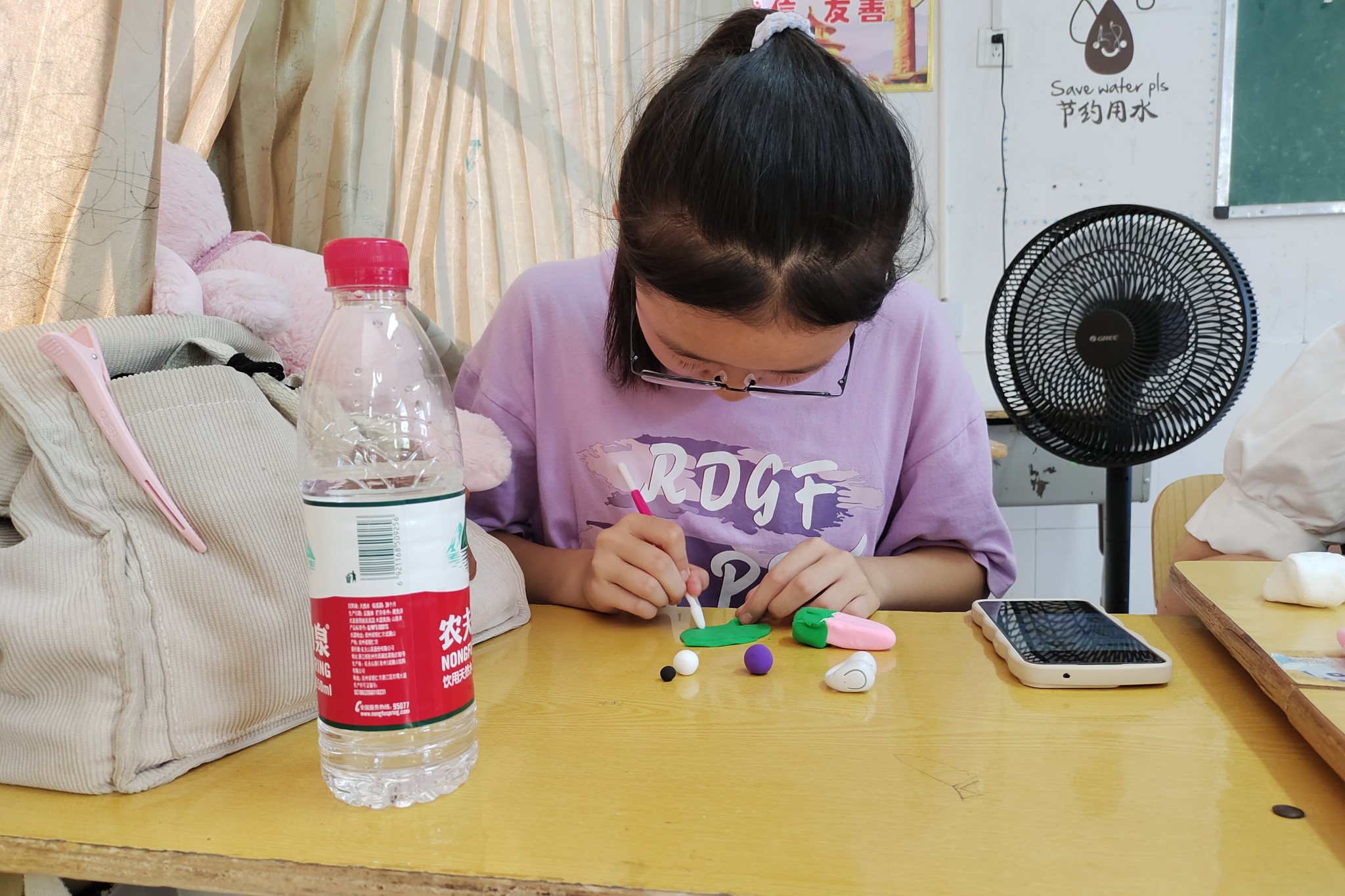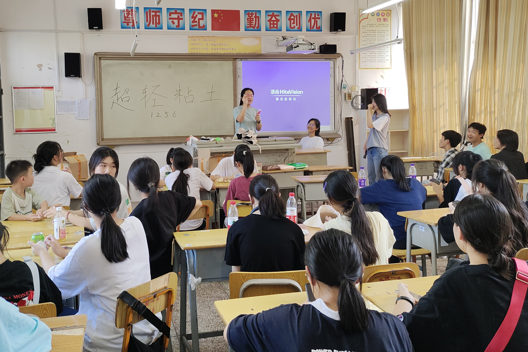 岳睿敏介绍超轻粘土是纸黏土的一种,因捏塑容易舒适被称为超轻土,并讲解制作工具的使用方法。她提醒同学们制作前需把超轻粘土充分揉匀,反复拉伸以达到作品表面更加光滑平整的效果,且需在黏土还未干时组合作品使各个部位粘得更为牢固。此外,岳睿敏建议捏作品时按照先大后小的原则,即先捏制大部件再捏小部件,以更好的把握超轻粘土的形状。实践团成员将材料分发给同学们并辅助他们制作。同学们参考网络图案并加以自身想法进行修饰,或根据想象力制作原创作品,完成后学生相互展示并将作品赠与实践团成员。