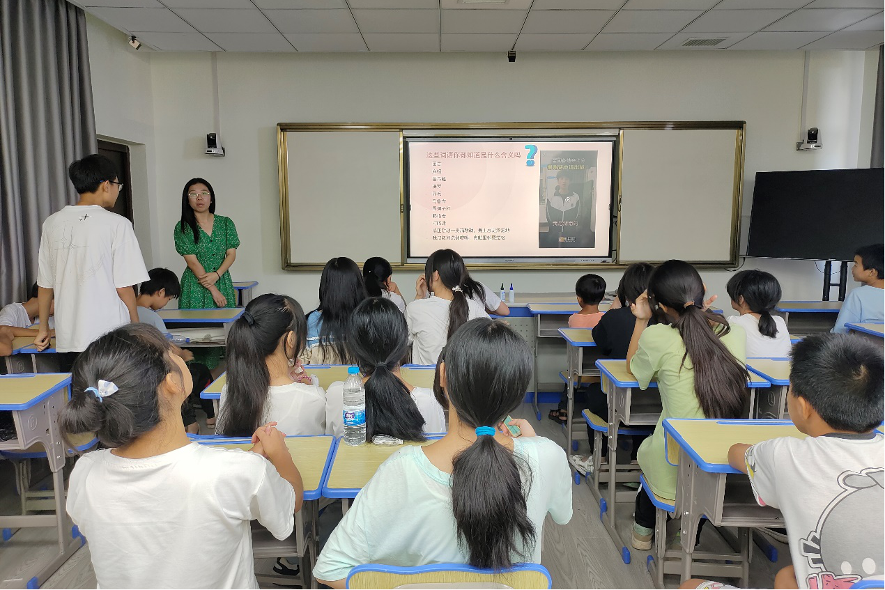 高天雅展示并介绍了各地具有代表性的方言,引入推广普通话的主题,她向同学们讲解了普通话的发展过程,并将方言的与普通话做对比。为帮助同学们深入思考为什么要学习普通话的问题以及推广普通话与保护方言之间是否存在冲突,高天雅播放了普通话推广宣传片,并向同学们解答了以上问题。学生们了解过后开始进行普通话朗读的尝试和绕口令大比拼。