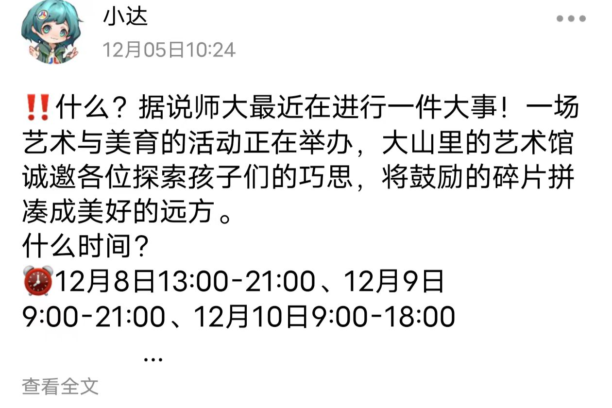 活动负责人向主办社团了解活动的相关背景及活动基本内容。活动负责人在达人学社会员群、QQ空间及微信朋友圈中进行线上宣传,并通过转发相关推文海报、活动通知、活动进程的方式向会员们介绍美丽中国及“大山里的艺术馆”,为社群同学答疑解惑。同时活动负责人鼓励会员们多多参与活动,增进大家对偏远地区艺术教育的了解,为同学们日后走上工作岗位积累经验。