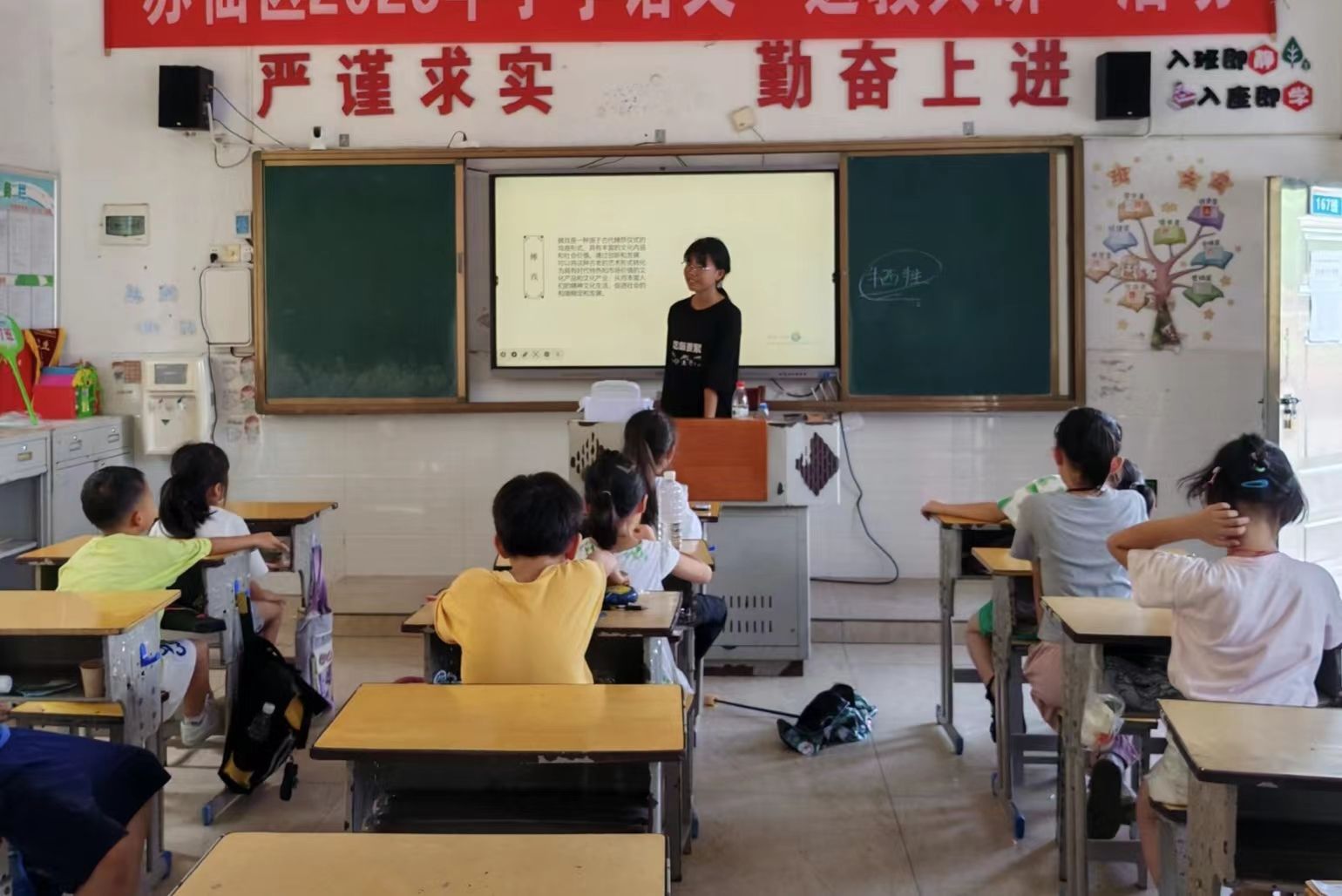 志愿者们为同学们授课,低年级由蔡珂岚讲授”非遗傩戏科普“,学生们在课堂上认真听讲,学习傩戏的基本信息、起源发展和表演形式等内容,领会傩戏的文化内涵。高年级是由朱婕讲授”微生物的奇妙世界“,老师通过PPT讲解和视频播放带领同学们探索奇妙的微生物世界,了解酵母菌在生活中的应用。志愿者组织学生放学并陪伴学生在公交站排队候车回家。