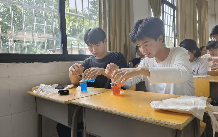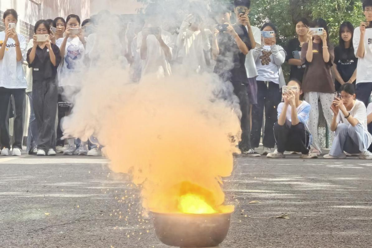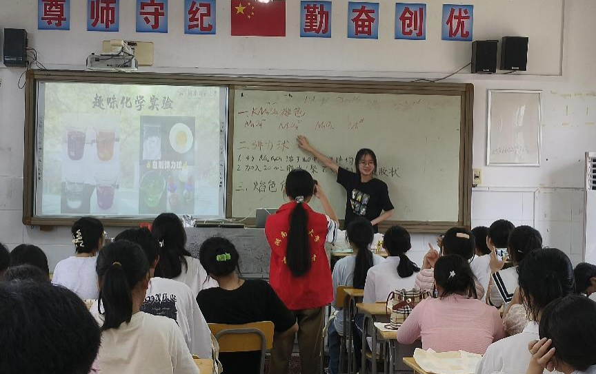 此次趣味化学实验活动聚焦于氧化还原反应、交联反应以及焰色反应等化学基础知识。实践团成员对实验原理进行讲解,并为学生演示动手操作具体步骤。部分成员为学生分发实验材料,帮助学生按照讲解的步骤进行操作。随后,成员们带领学生前往操场观看焰色反应实验。同时,为保证学生安全,成员们要求学生站在实验地点五米以外的位置进行观看。部分成员对实验过程及反应现象进行记录。