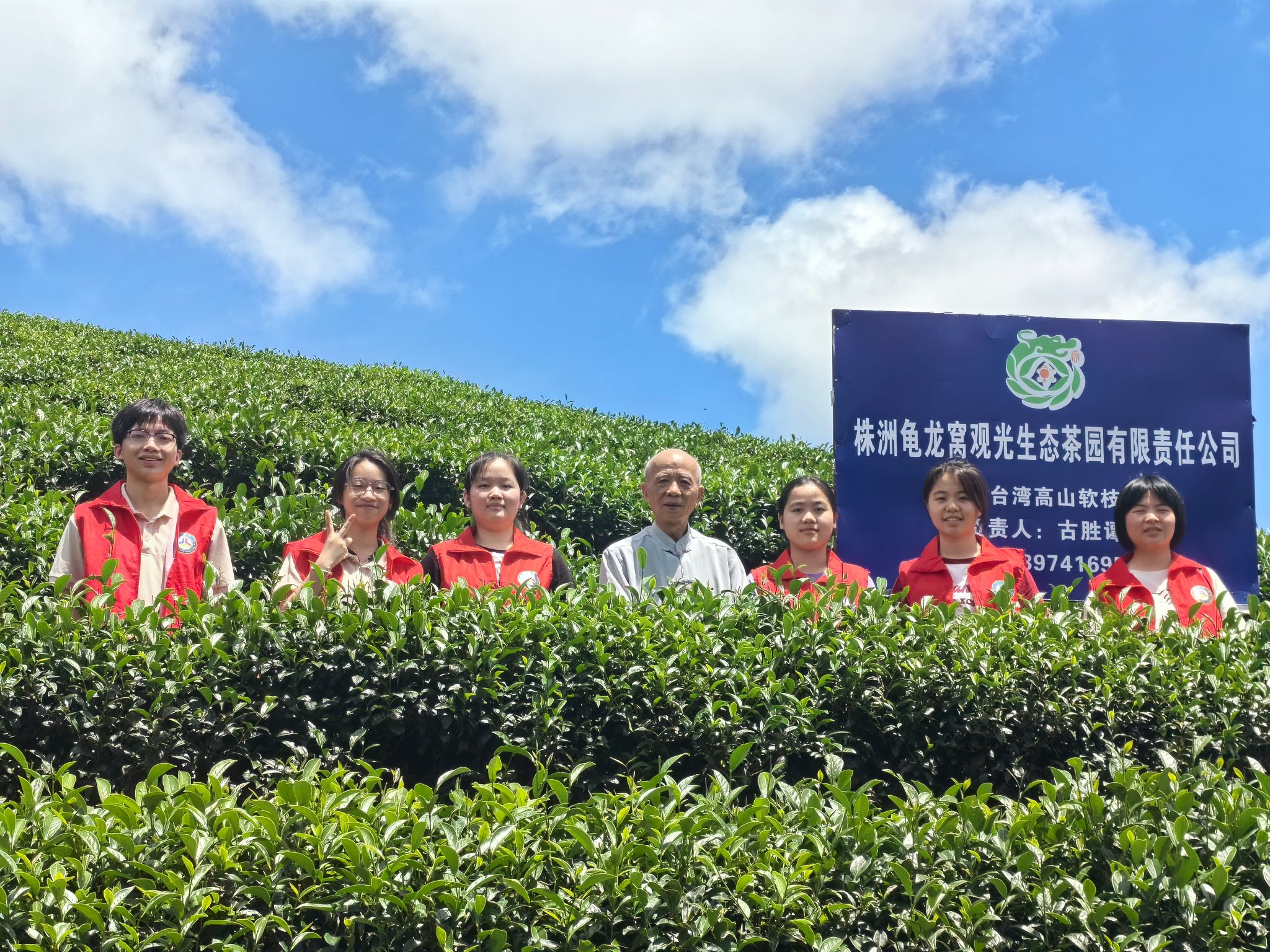 实践团成员前往龟龙窝茶园采访茶园主,并在茶园主带领下参观龟龙窝茶园特色展示区。在茶园主介绍下,成员们了解该茶园占地约1500亩,因山形似龟龙盘卧而得名“龟龙窝”。茶园主表示他是台湾人,因受邀而前来大陆创业。他经多次实地考察后选定龟龙窝进行茶叶种植,并解释所选茶种在种植初期因不适应高海拔的低气温而产量低,但经过品种改良后茶叶产量得到提高。他表示龟龙窝的自然条件和当地传统的手工制茶技艺为茶叶品质提供了重要保障。随后,茶园主为成员们泡制炎陵红茶和绿茶并邀请成员们品尝。成员们与茶园主前往茶田合影留念。