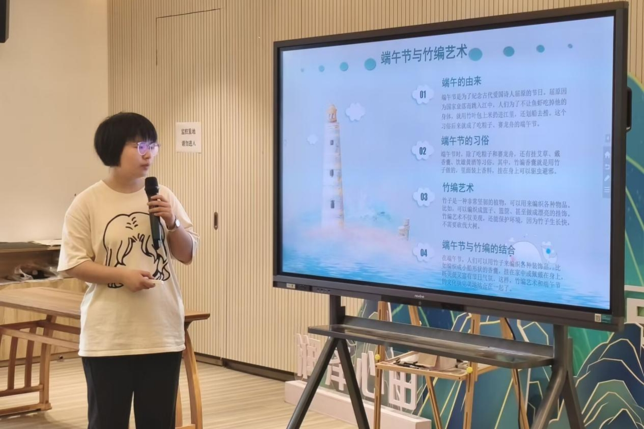 志愿者提前抵达活动场地,明确分工,有序引导小朋友完成签到并就座,同时维持现场秩序。主讲人围绕活动主题展开讲解,向小朋友提问端午节习俗相关问题,志愿者给积极作答的小朋友发放可爱贴纸作为奖励。主讲人与小朋友交流互动,依次介绍端午节与竹编艺术、竹编历史的渊源,并就竹的诗句及象征含义进行提问和讲解,阐述竹编工艺和文化价值。手工环节,主讲人播放竹编小船手工编制视频,志愿者们给予小朋友们编制指导与帮助。活动结束后,志愿者组织展示竹制小船作品的小朋友们共同合影留念。
