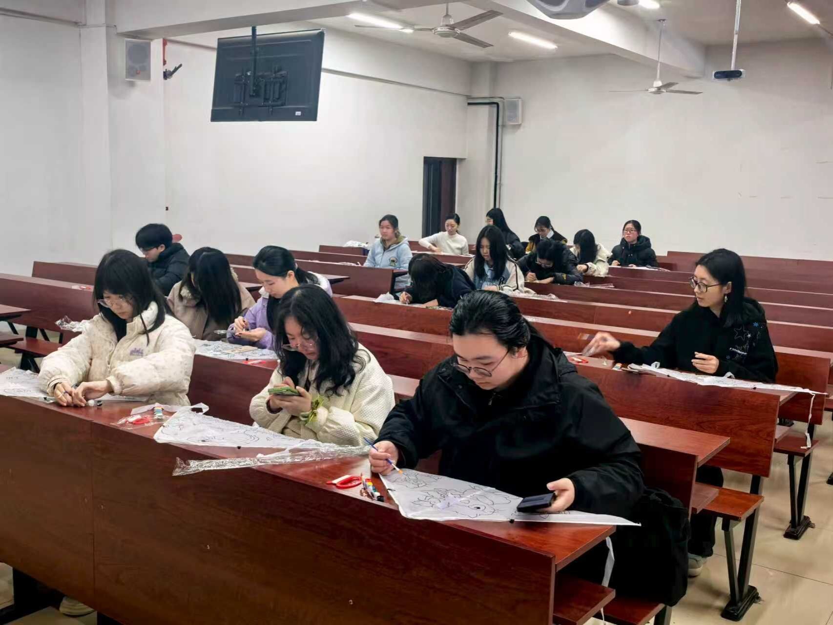 主持人结合创作材料,为大家讲述风筝的穿线技巧,固定支撑方法,以及创作时的相关注意事项。她拆解步骤,按步骤示范要点,帮助大家清晰掌握绘制流程。通过主持人的讲解,同学们初步了解风筝的结构,熟悉创作过程。在活动过程中,理事们耐心为同学们解疑答惑,保障活动顺利进行。同时,同学们积极交流想法,互相启发思路、分享灵感,基于图案样式绘制出一幅幅充满巧思的风筝作品。活动尾声,理事们整理工具,清理桌面场地卫生,协助完成各项收尾工作。