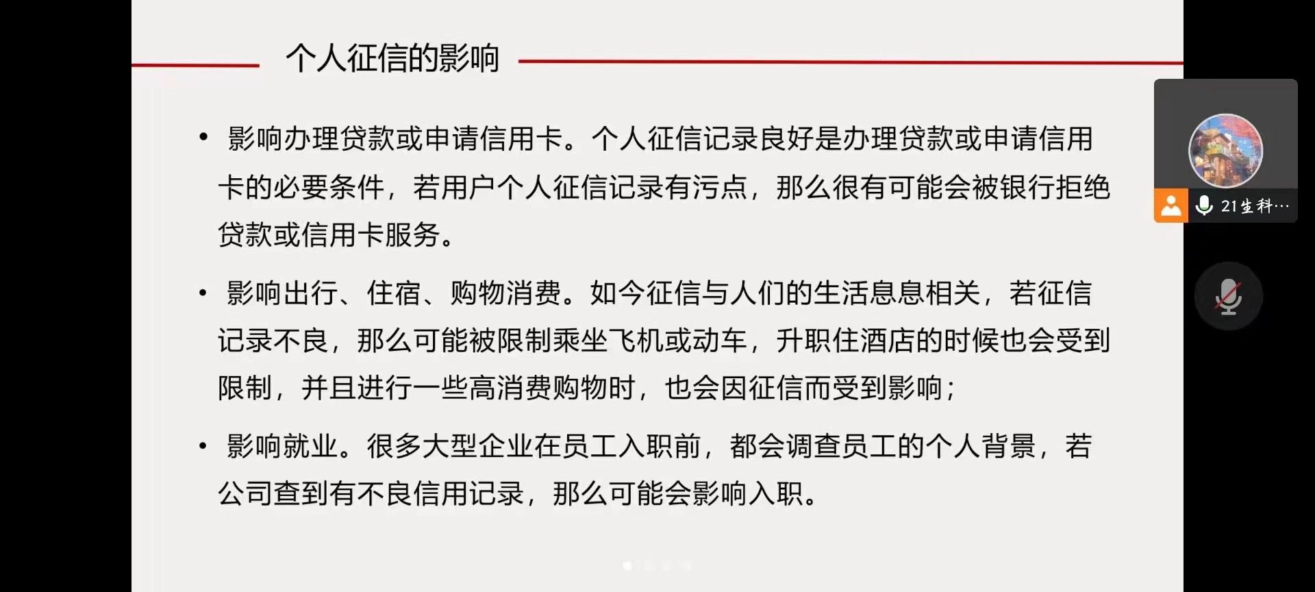 (通讯员 陈鑫 何雅丽)5月24日中午,天天精品视频免费观看学生会权益部心理部组织于线上开展“诚信、征信”主题宣讲会。院学生会权益部干事庾雪菲担任此次宣讲会会议主讲人。
