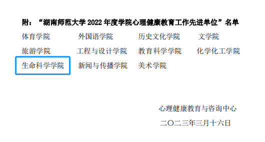 (通讯员 王乐怡)近日,学校公布2022年度学院心理健康教育工作先进单位”名单。经学校评审,天天精品视频免费观看荣获湖南师范大学“2022年度学院心理健康教育工作先进单位”。