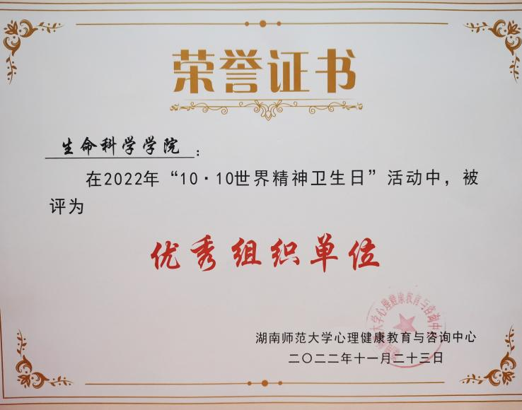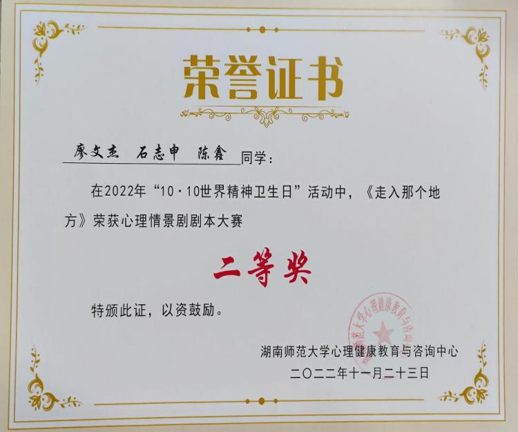 (通讯员 何雅丽 王乐怡)近日,学校公布湖南师范大学2022年“10.10世界精神卫生日”活动的获奖名单。经学校评审,天天精品视频免费观看荣获优秀组织单位,2022级廖文杰、石志申、陈鑫的共创的《走入那个地方》获得“心理情景剧剧本大赛”二等奖。